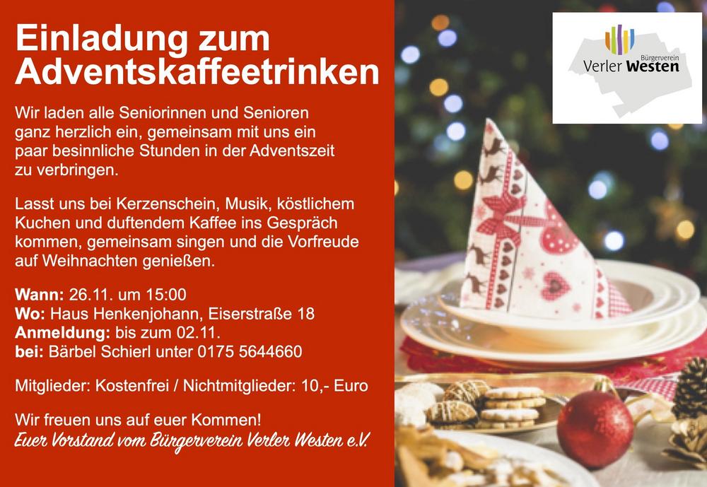 Der Bürgerverein Verler Westen e.V. lädt zu einem gemütlichen Nachmittag in stimmungsvoller Atmosphäre ein – genau das Richtige, um die Adventszeit einzuläuten. Bei Kerzenschein, Musik, köstlichem Kuchen und duftendem Kaffee lässt sich wunderbar plaudern, gemeinsam singen und die Vorfreude auf Weihnachten genießen.