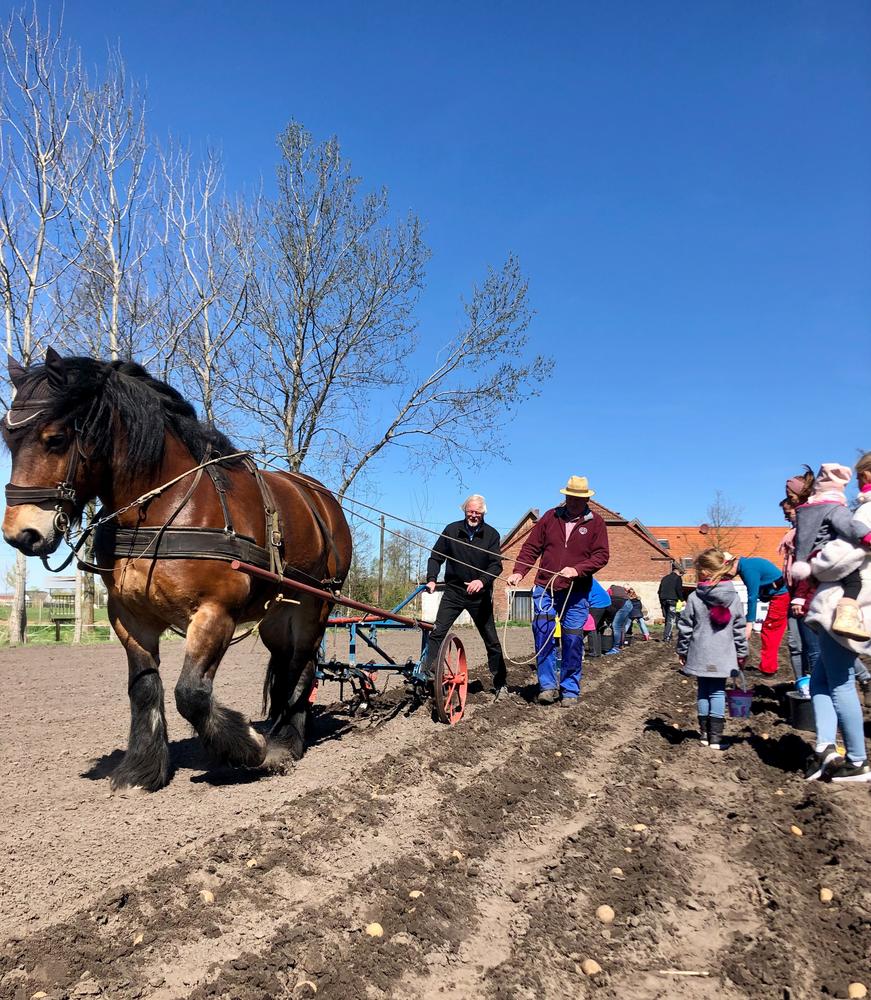 Der Fuhrwerksunternehmer Gerd Aschoff kommt wieder mit seinem Kaltblut-Pferd Adam und zieht mit einem Vielfachgerät der Marke Köckerling aus dem Jahr 1955 Furchen in den Acker. Anschließend müssen die Kartoffeln einzeln händisch in die Löcher gelegt werden, ganz so, wie es früher üblich war. Für diese gemeinschaftliche Aktion werden zahlreiche Helferinnen und Helfer gesucht. Besonders angesprochen sind Familien mit Kindern, die auf diese Weise hautnah den Kartoffelanbau erleben können, so wie es früher war.