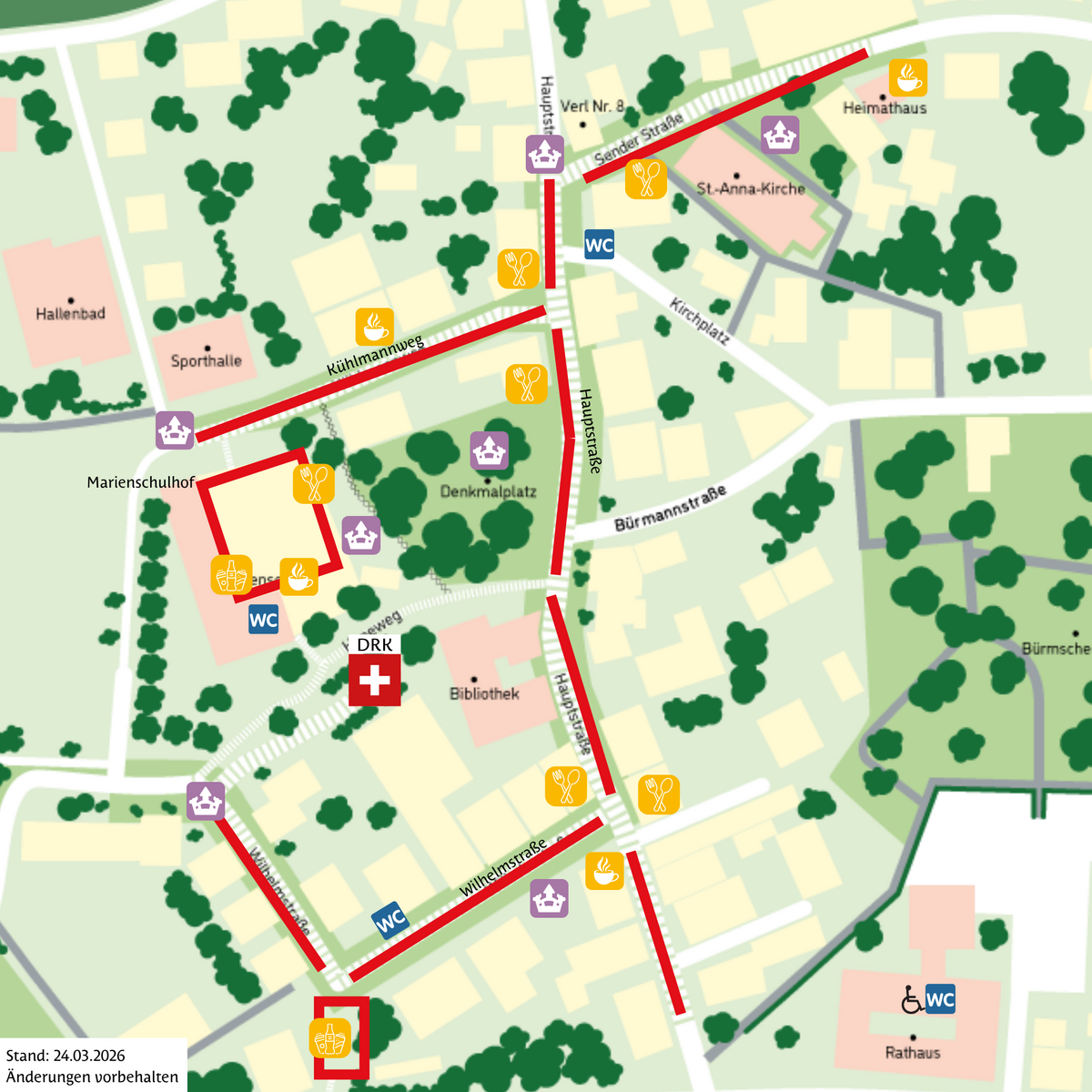 Die Frühstückstafel und das Rahmenprogramm finden nicht mehr wie in den Vorjahren auf der Ortsdurchfahrt (Paderborner und Gütersloher Straße) statt, sondern die Tische werden im Bereich Hauptstraße, Wilhelmstraße, Sender Straße (bis zum Heimathaus) und Kühlmannweg sowie auf dem Schulhof der Marienschule aufgebaut. An jedem Tisch gibt es jeweils acht Plätze.