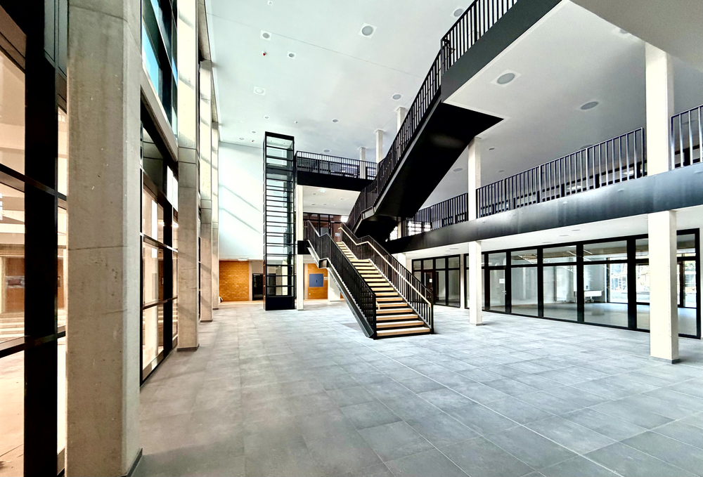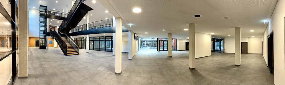 Der Rohbau des Bauteils „Neue Mitte“ wurde bereits im Juni 2024 fertiggestellt und der Innenausbau läuft derzeit auf Hochtouren. Die große Stahl-Freitreppe und die Galerie-Geländer sind eingebaut, Estrich- und Fliesenbeläge in den Obergeschossen weitgehend fertiggestellt und die Montage der abgehängten Akustikdecken in den Klassen- und Fachräumen ist im Gange. Im Erdgeschoss sind die Estricharbeiten abgeschlossen, sodass das Raumgerüst zur Ausführung der Trockenbaudecke in der großen, dreigeschossigen Halle gestellt werden kann. Als nächstes folgen die Fliesenarbeiten im Erdgeschoss der "Neuen Mitte" und dem neuen Eingangsbereich. Auch die Arbeiten am Gründach sind so gut wie abgeschlossen. Die Fertigstellung der „Neuen Mitte“ ist für das 1. Quartal 2026 vorgesehen.