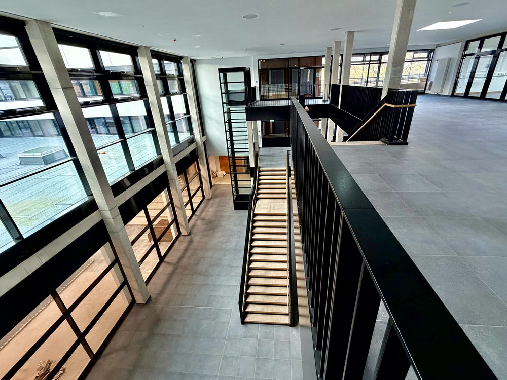 Derzeit stehen in der Neuen Mitte die Ausbaugewerke im Fokus. Der Estrich ist größtenteils eingebaut, Elektro, Heizung, Lüftung und Sanitär befinden sich in der Endphase der Rohinstallation. Der Einbau der Freitreppe ist in Vorbereitung, sodass sich erahnen lässt, wie zukünftig vom neuen Haupteingang über das zentrale Treppenhaus die Verteilung in die einzelnen Bereiche der Schule erfolgt. Großzügige Fensterflächen ermöglichen von der Neuen Mitte einen Ausblick ins zukünftige Selbstlernzentrum (ehemals PZ) des Altbaus und in den neuen Innenhof zwischen Neuer Mitte und Neubau. Im Innenhof entstehen gerade die Außenanlagen, die künftig für eine offene und einladende Gestaltung sorgen.