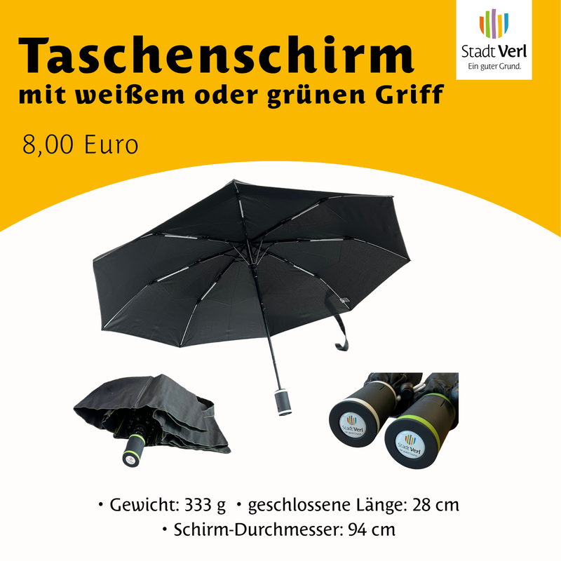 - Taschenschirm mit weißem oder grünem Griff, Gewicht: 333 g, Schirmdurchmesser: 94 cm, geschlossene Länge: 28 cm – 8,00 €